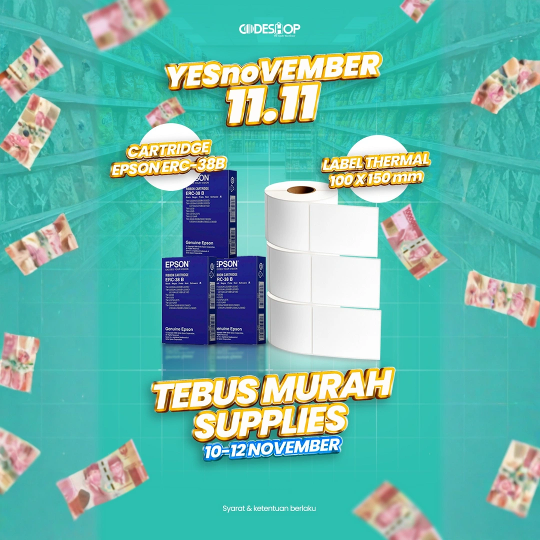 CodeShop Indonesia kembali menghadirkan program promo menarik bagi pelaku usaha retail, F&B, ekspedisi, dan berbagai lini bisnis yang membutuhkan perlengkapan kasir dan suplai cetak harian. Promo ini bertajuk Tebus Murah Supplies, di mana pelanggan dapat membeli produk kebutuhan operasional dengan harga spesial tanpa syarat pembelian minimum.